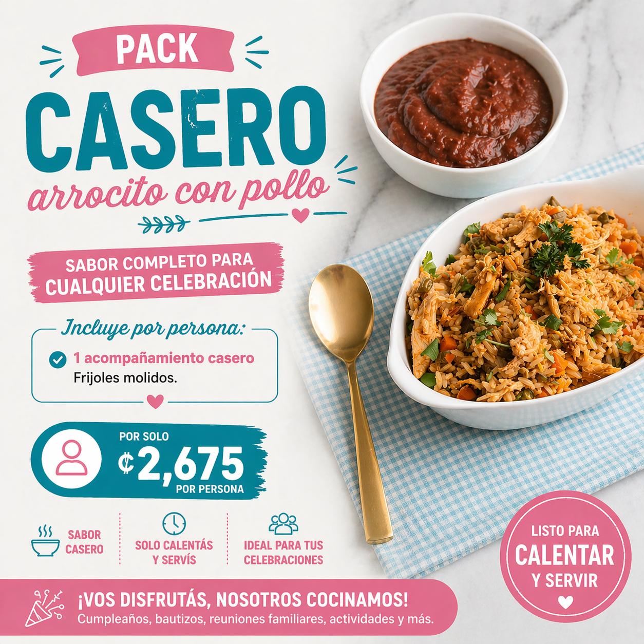 ✔ Incluye arroz con pollo + 1 acompañamiento casero por persona